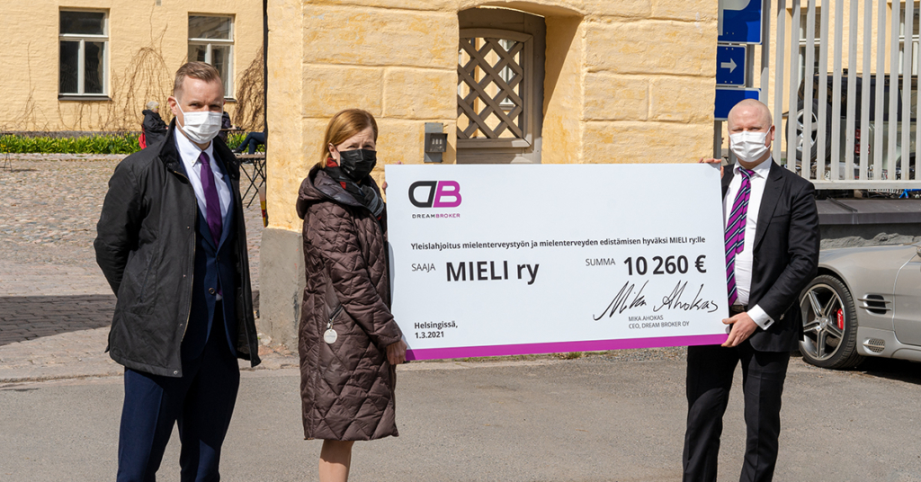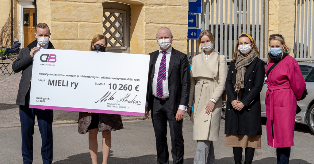 In December 2020, Dream Broker announced that it will donate 5 euros on behalf of each of its enterprise customer, directing it to MIELI ry. With the donation, the aim is to support the association’s valuable work in developing mental healthcare services. By exceeding the level of a thousand enterprise customers by the end of the year, Dream Broker promised to increase donated amount per customer to 10 euros. At the end of the year 2020, the number of enterprise customers grew to 1026, resulting in a total donated amount of 10 260 euros. The donation is considered a general donation and it was granted to MIELI ry in March 2021.